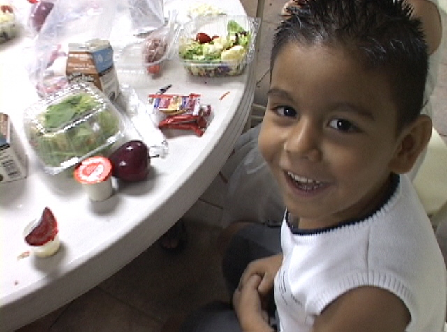 A young SNAP recipient eats at the Help 4 Kidz Café while his parents apply for SNAP with the help of a volunteer case manager.