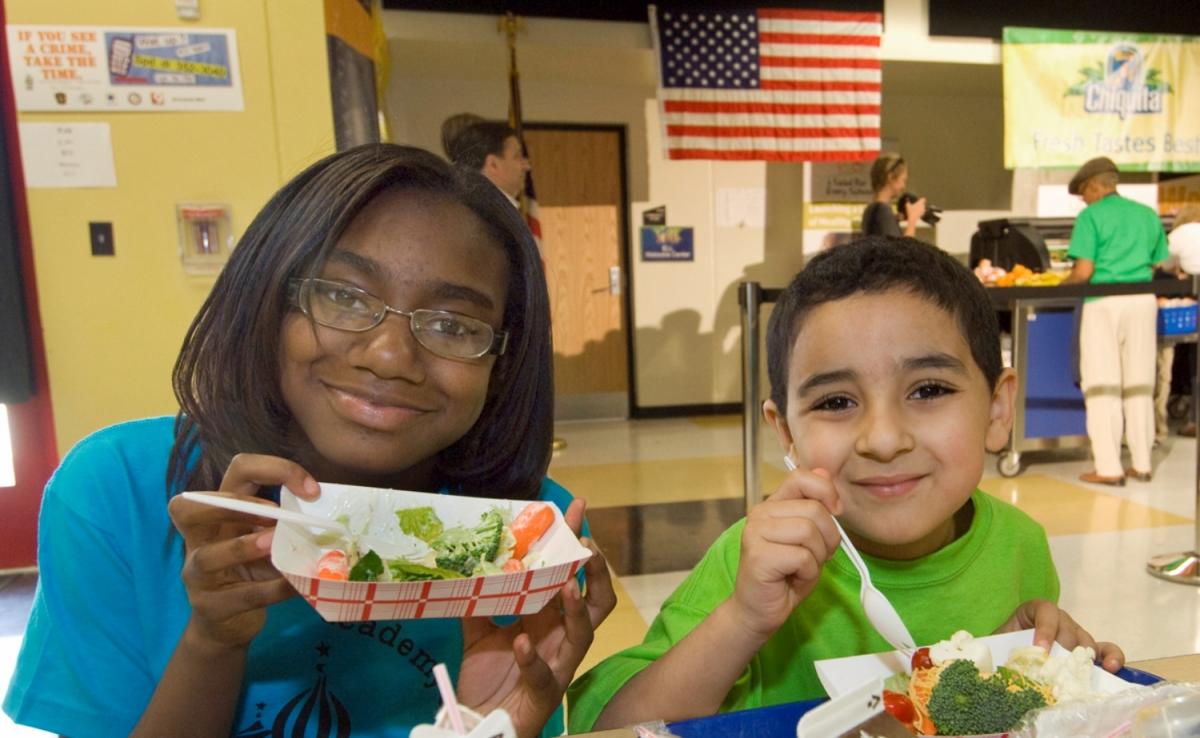Students from Cincinnati Public Schools’ Academy of World Languages enjoying fresh vegetables and fruits from their salad bar.