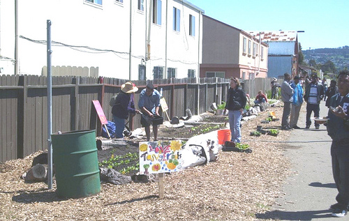 Volunteers plant fruit trees as part of the Edible Forest in Richmond, Calif.