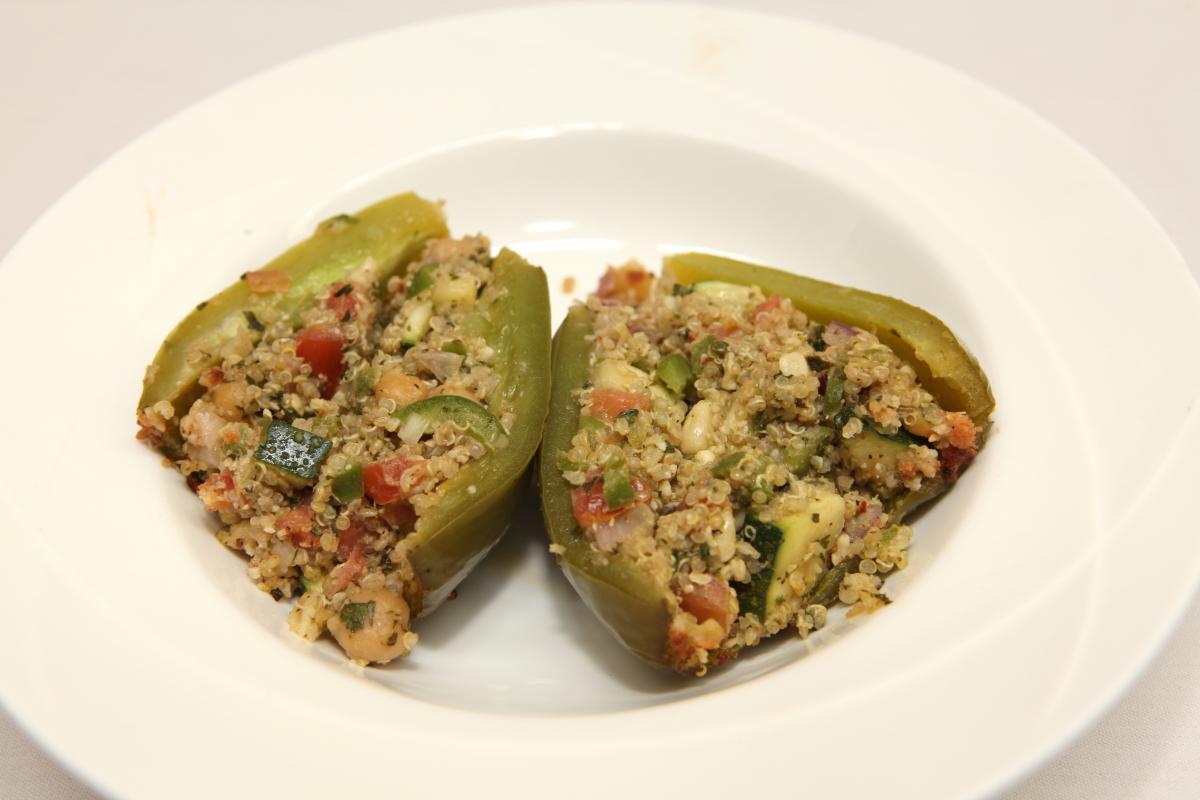 Arrange the peppers in a large baking dish and stuff each one with an equal amount of the quinoa-vegetable mixture. Top each pepper with an equal amount of the Parmesan–bread crumb mixture. Pour about 1/4 inch of water into the bottom of the baking dish, cover it with foil, and bake until the peppers are tender, about 20 minutes. Remove the foil and place the peppers under the broiler, broiling just until the Parmesan–bread crumb mixture is light golden brown.