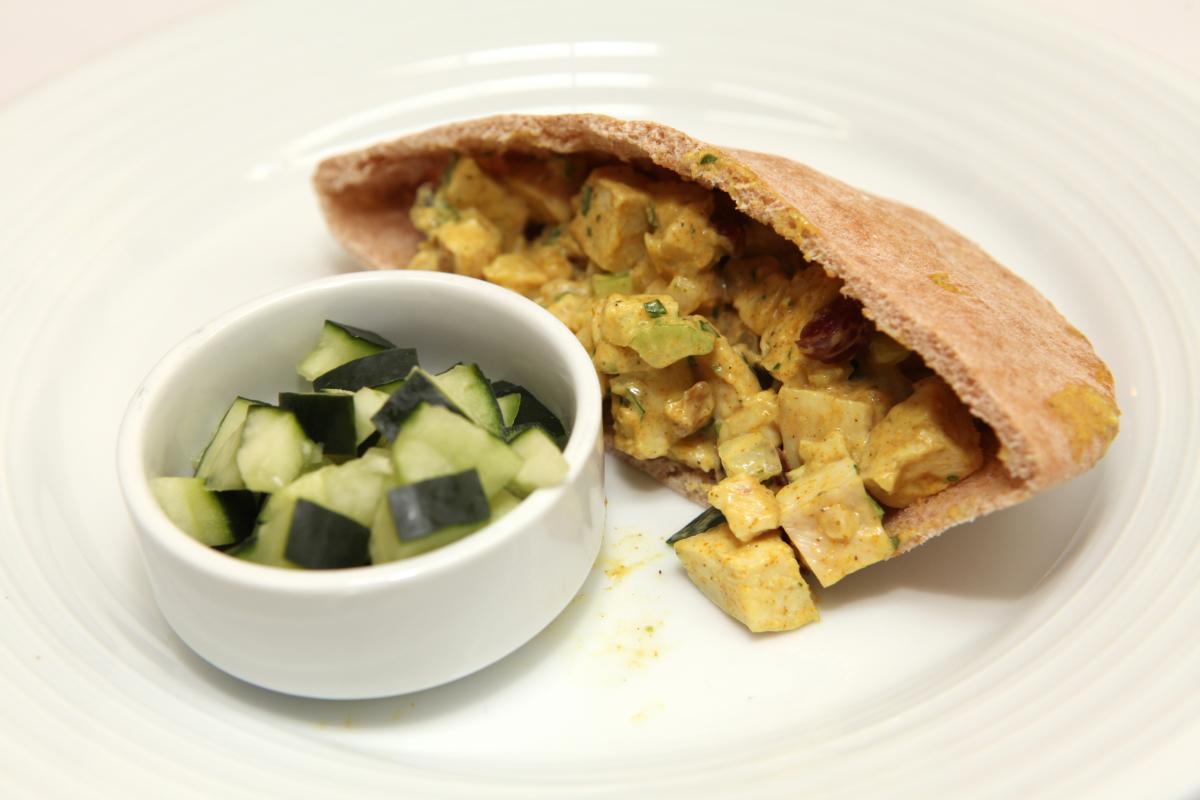In a medium bowl, whisk together the mayonnaise, curry powder, salt, and pepper. Add the chicken, celery, onion, almonds, and grapes and stir, being careful not to crush the grapes. Fill each pita with about 1/2 cup chicken salad and garnish with lettuce leaves, if using.