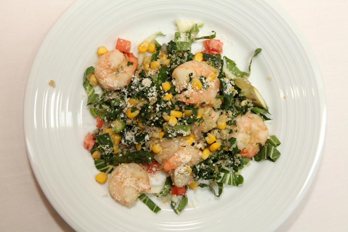 - In the same sauté pan over moderate heat, warm the remaining 1 tablespoon olive oil. Add the onion and sauté until translucent, about 3 minutes. Add the quinoa and cook, stirring occasionally, for about 1 minute. Add the chicken stock and bring to a boil, stirring occasionally. Reduce the heat and simmer for 5 minutes. Add the kale, peas, corn, and tomato and cook until the quinoa is tender, about 5 minutes. Add the cooked shrimp and gently stir to combine. Add the Parmesan, and season with salt and pepper. Serve hot!