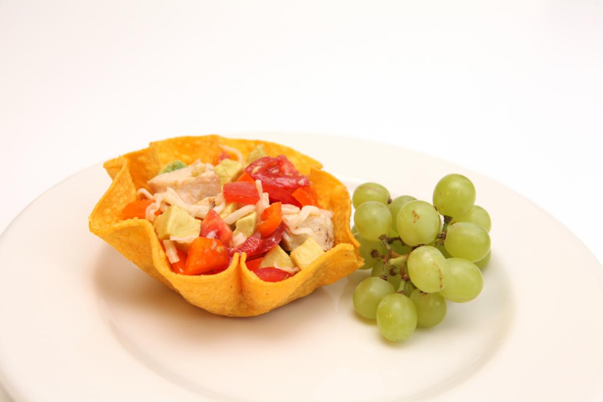 - In a medium bowl, toss together the chicken, avocado, bell pepper, tomato, and cheese. Season with salt and pepper, scoop into the tortilla bowl, and serve immediately.