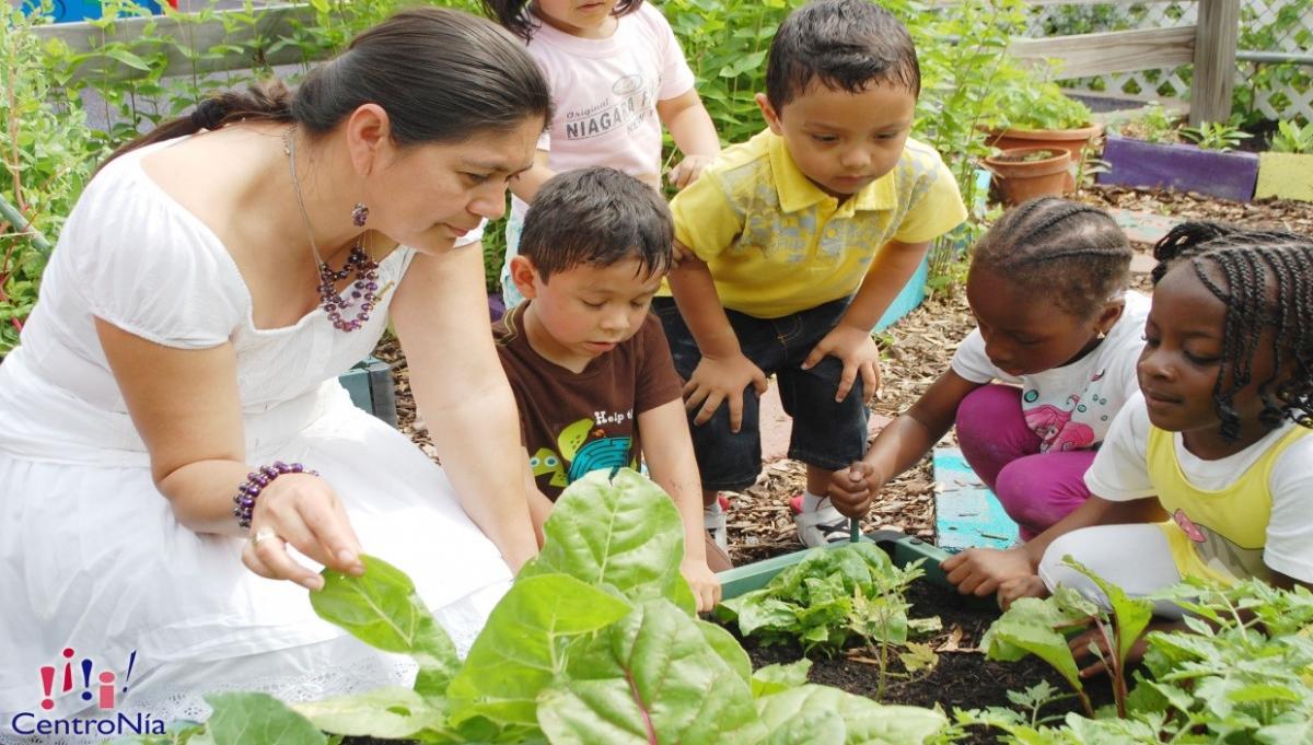 CentroNia students and teacher work together in the garden. (Photo courtesy of CentroNia)