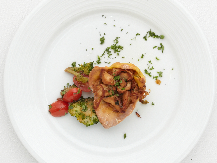 - Preheat oven to 350°F. Lightly spray a cupcake pan or muffin tin with olive oil or cooking spay. Dip rice paper wrapper in warm water. Place 2 of these wet wrappers in each cupcake cup and bake in the oven for 15 minutes. Let cool, remove the tin, then scoop chicken and vegetable mixture into the rice paper cup and serve.