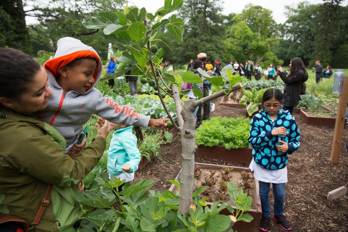 Parents, staff and students who participated in the "Let’s Move!" sub-initiative programs, take a tour of the White House Kitchen Garden on the South Grounds of the White House, June 3, 2015. (Official White House Photo by Lawrence Jackson)
