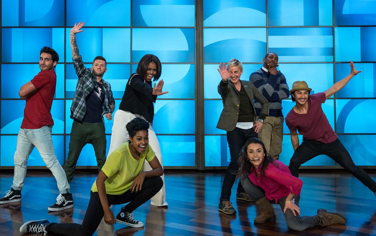 First Lady Michelle Obama, Ellen DeGeneres and SYTYCD dancers perform a #GimmeFive dance during a taping of ellen, the Ellen DeGeneres Show, in Burbank, Calif., March 12, 2015. (Official White House Photo by Amanda Lucidon)