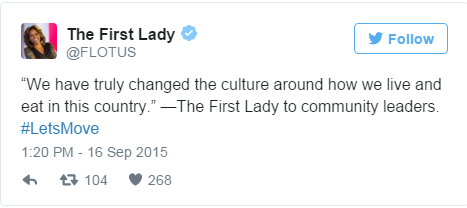 The First Lady challenged everyone to #GimmeFive things they are doing to eat better, be more active, and lead a healthier life. People from across the country joined in the challenge – from kids, families, and schools to celebrities and athletes, like Beyonce, Dwyane Wade, Jack Johnson and so many others.