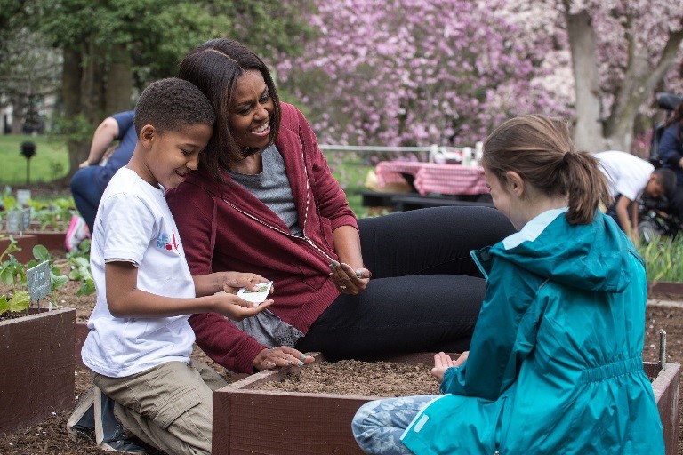 First Lady Michelle Obama joins students for the spring garden planting in the White House Kitchen Garden, April 15, 2015. (Official White House Photo by Chuck Kennedy)
