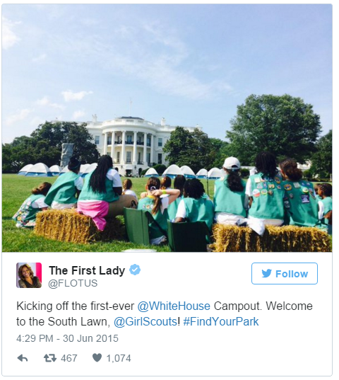 The First Lady invited 50 Girl Scouts to participate in the first-ever campout on the South Lawn to celebrate the centennial of the National Park Service and promote getting kids and families moving while taking advantage of America’s great outdoors as part of Let’s Move! Outside.