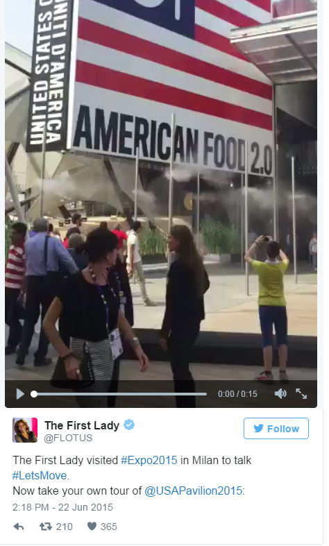 First Lady Michelle Obama is greeted by student ambassadors along with the US Delegation outside of the USA Pavilion at the World Expo in Milan, Italy, June 18, 2015. The First Lady, in support of the "Let's Move!" initiative, leads a presidential delegation to the expo, "Feeding the Planet, Energy for Life." (Official White House Photo by Amanda Lucidon)