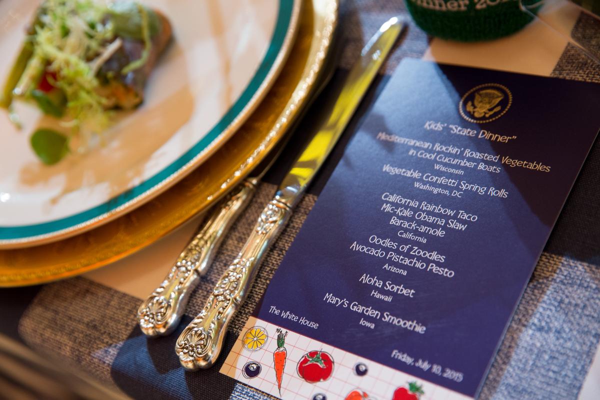 The dinner menu at the Kids' State Dinner in the East Room of the White House hosted by the First Lady, July 10, 2015. (Official White House Photo by Amanda Lucidon)