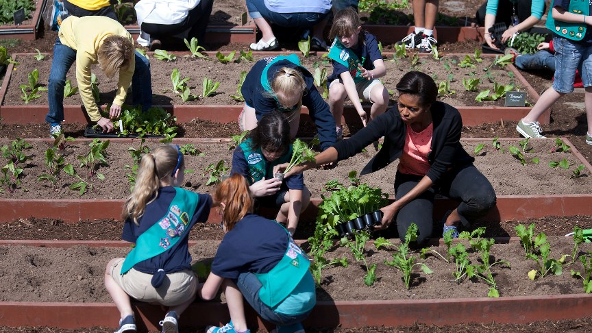 First Lady Michelle Obama joins students for the spring White House Kitchen Garden planting on the South Grounds