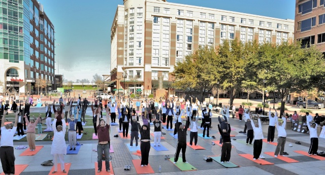 Yogathon participants in the Sugarland, TX town square.