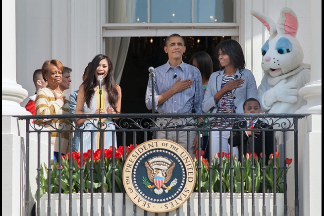 President Barack Obama, First Lady Michelle Obama, daughters Sasha and Malia, and Marian Robinson listen to Jessica Sanchez sing the National Anthem on the South Portico at the 2013 White House Easter Egg Roll, April 1, 2013. (Official White House Photo by David Lienemann)